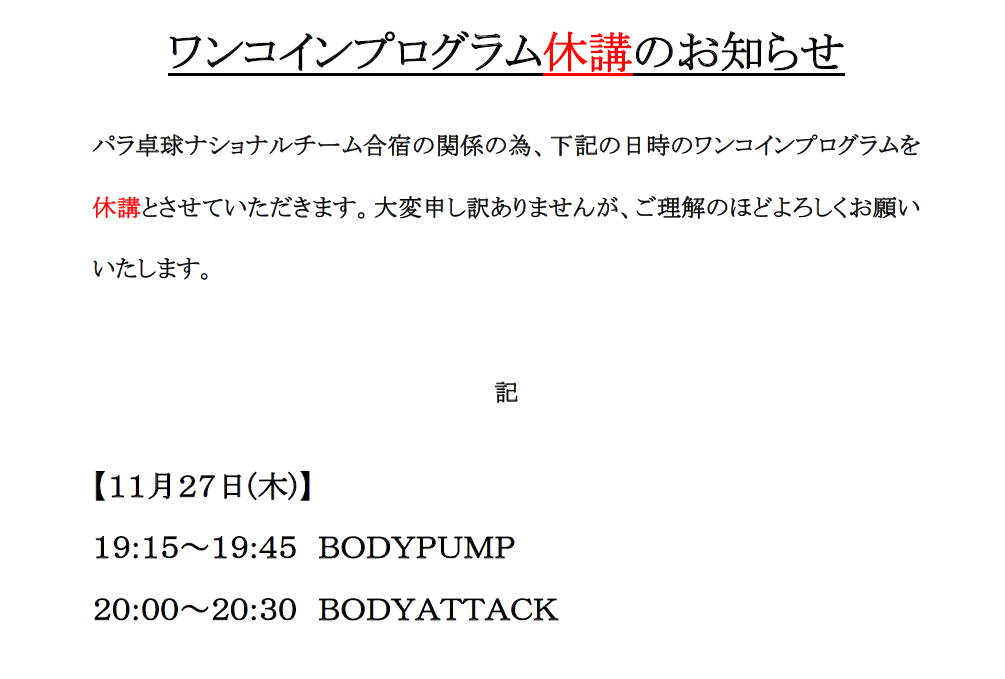 【11月27日(木)】ワンコインプログラム休講のお知らせ